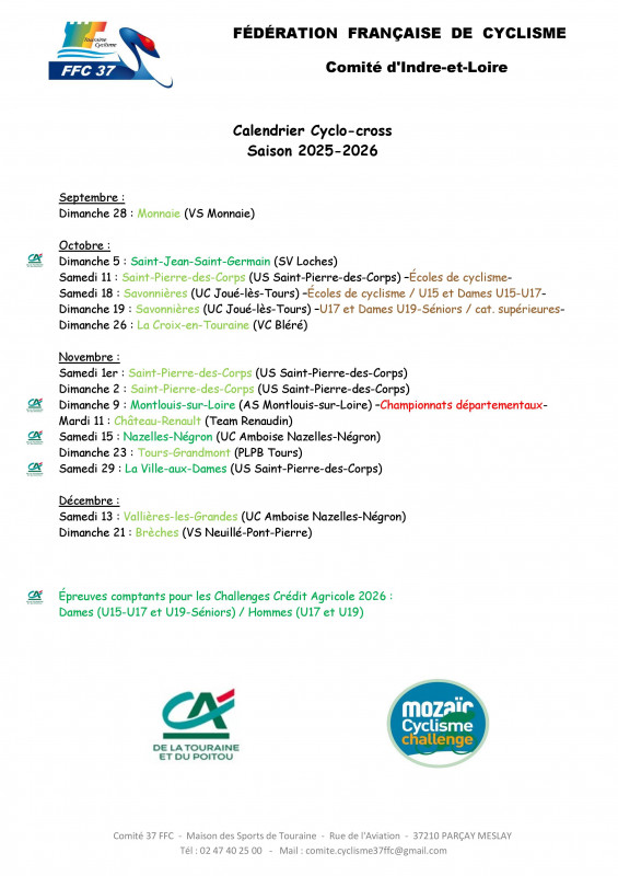 Contrairement à ce qui était initialement prévu, aucune épreuve des Championnats départementaux de cyclo-cross, du Dimanche 9 Novembre à Montlouis-sur-Loire, ne comptera pour les Challenges Crédit Agricole.