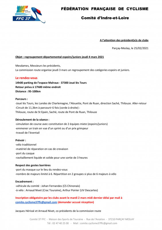 Le Jeudi 4 Mars, le comité départemental organise un regroupement Route pour les Juniors et les Espoirs.